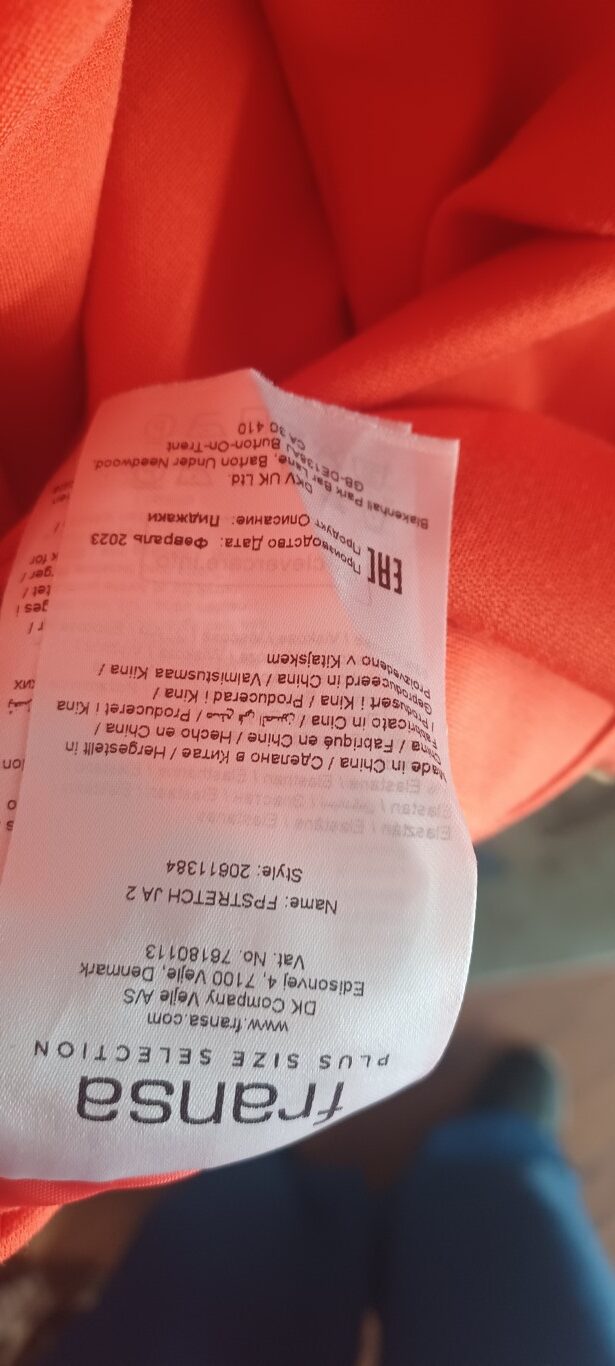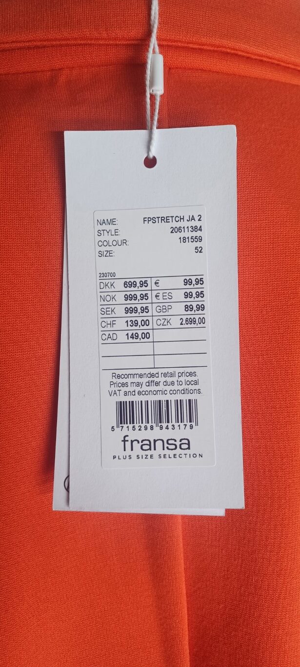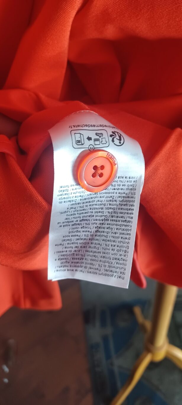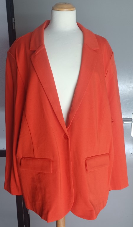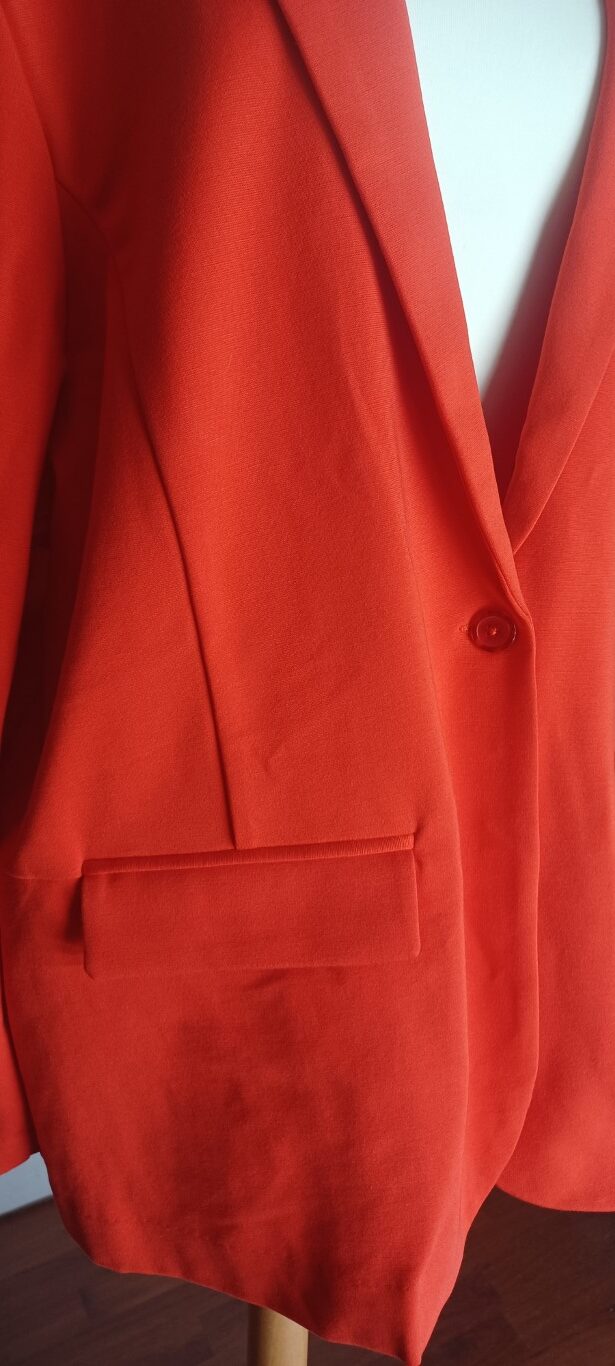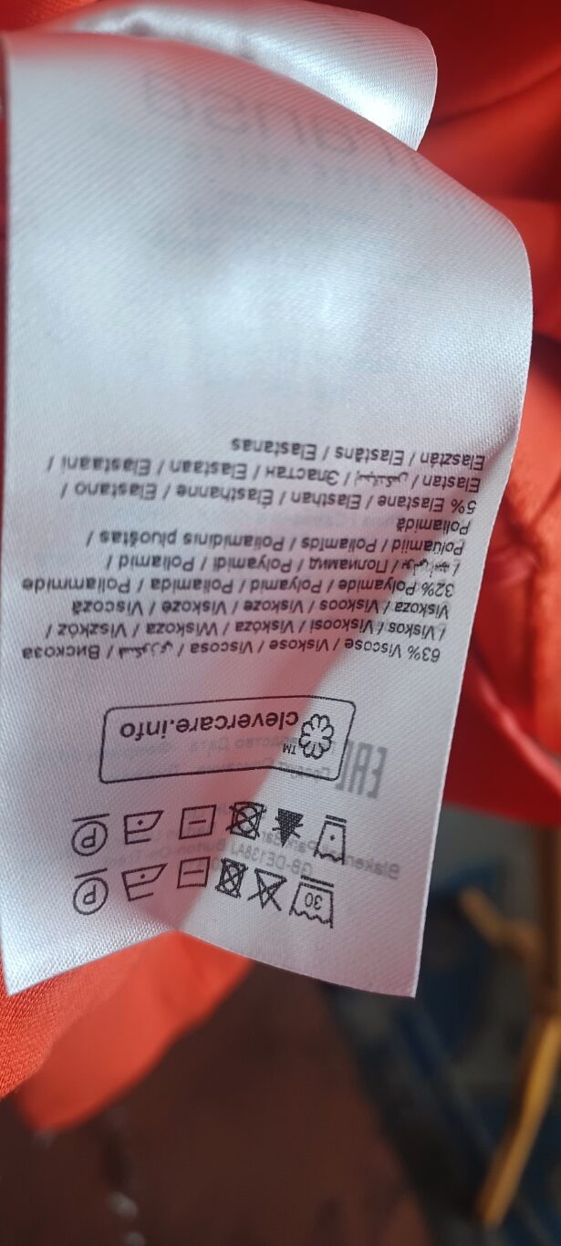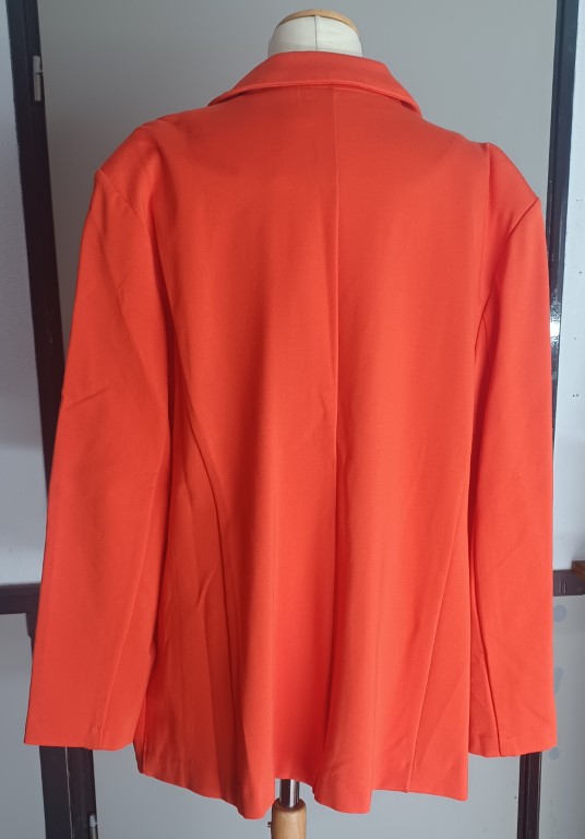 Nette koraalroze blaser/jasje, 53% rayon (viscose), 42% polyamide, 5% spandex (elastaan). (De 3e foto is iets anders van kleur door het kunstlicht).