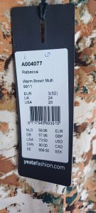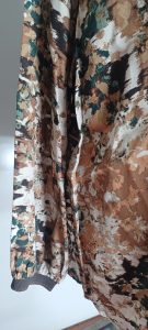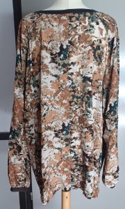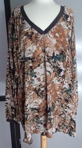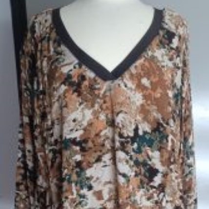 Nieuwe longsleeve met een allover print. Dit shirt heeft een lage V-hals, afgezet met een bruine bies welke terug komt op de mouw. Model Rebecca. 100% viscose.
